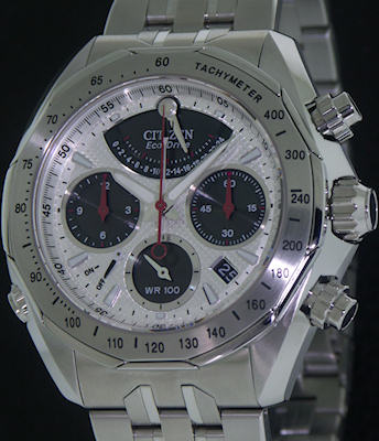Citizen Signature Flyback Chronograph with a stylish stainless steel look dimensional dial. The movement features a 1/5 second chronograph, dual time, and an alarm. A large 44mm case houses this beautiful solar powered watch.