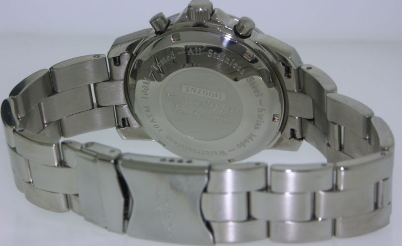 Day/Date calendar, window display. 12 hr, 30 min, 60 sec registers chronograph.