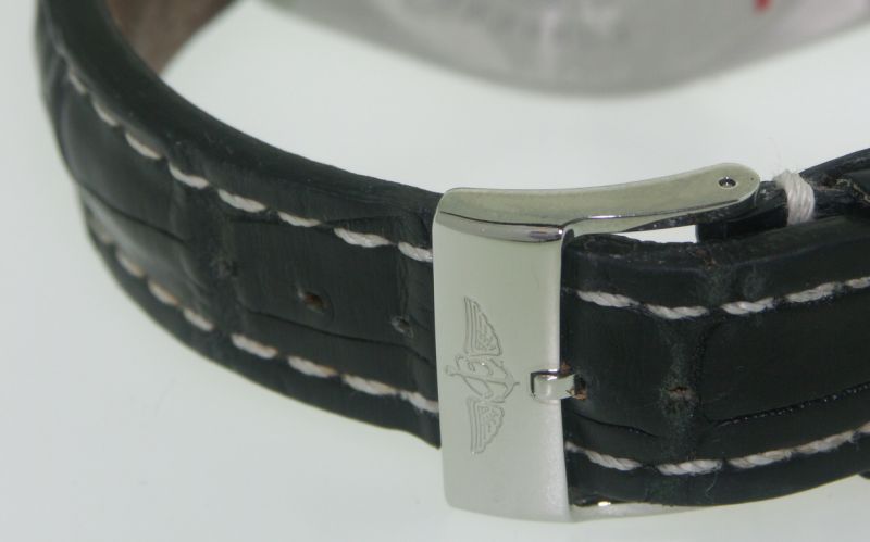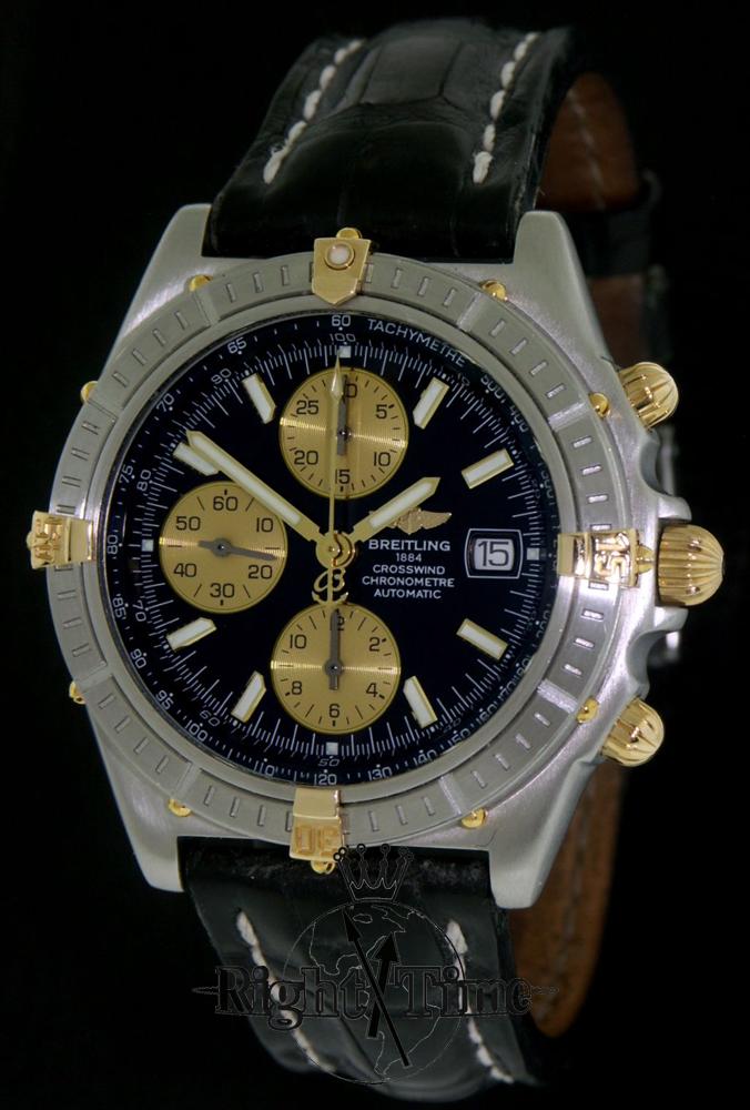 Classic black and gold combo, Swiss made Breitling "Crosswind" model B13355 with automatic chronograph movement housed in satin finish 43mm stainless steel case 18kt yellow gold bezel accents black factory alligator strap matching black dial
