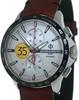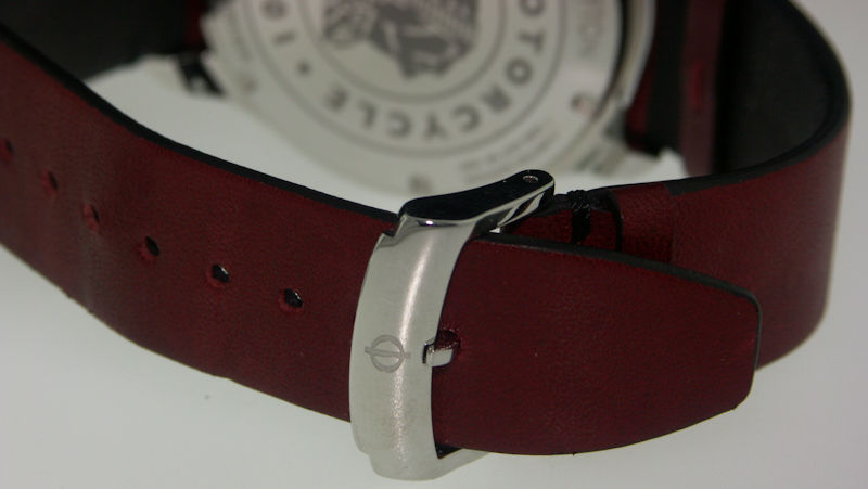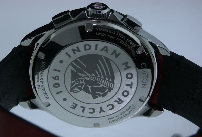 B&M "Clifton Club Indian Motorcycle" limited edition. Named for Burt Munro who in 1967 coaxed his beloved streamlined Indian to 190.07 mph, a world record. Factory model MOA10404. High polished stainless steel case. Silver dial with Burt Munro`s "35" on the small seconds window. Swiss made ETA Valjoux 7750 automatic chronograph. Fixed black tachymeter bezel. Comes in a set with both a red and black calf strap.