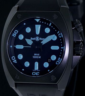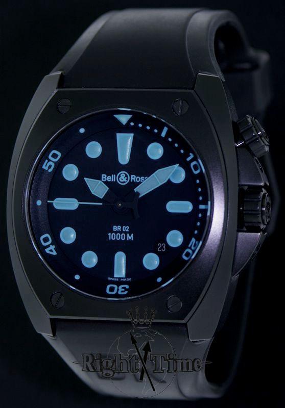 Bell & Ross "MARINE" collection BR02-92BLU black PVD stainless steel case divers watch with inner rotating bezel, black dial with blue luminous markers and hands on black rubber band