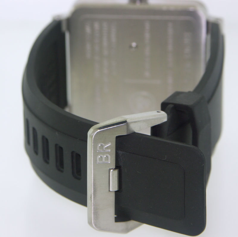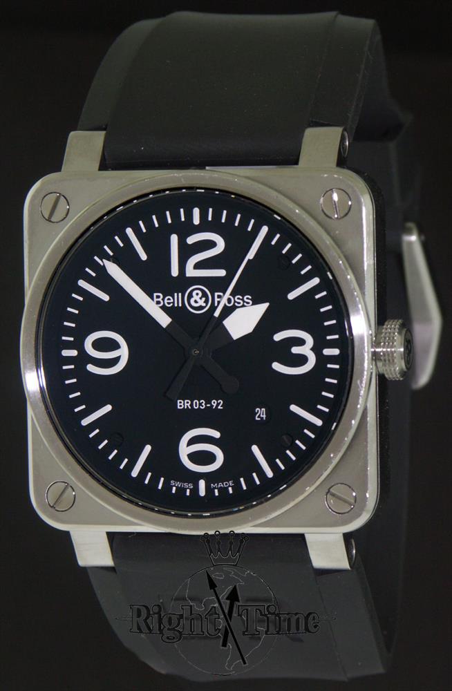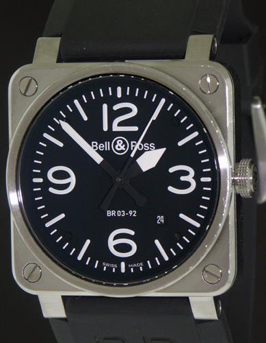Bell & Ross Aviation BR 03-92 Steel. Signature Bell & Ross square shaped solid stainless steel case with 4 screws. Black aviator style dial with luminous numerals/markers. Swiss automatic movement. Sapphire crystal. Comes on black rubber strap,