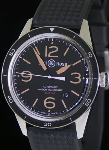 Bell & Ross BR123, from the Sport Heritage collection. Polished stainless steel case with a vintage inspired domed sapphire crystal. Black dial with khaki colored luminous Arabic numerals, hands, and markers. BR-CAL.302 Swiss-made automatic movement. Black textured rubber strap.