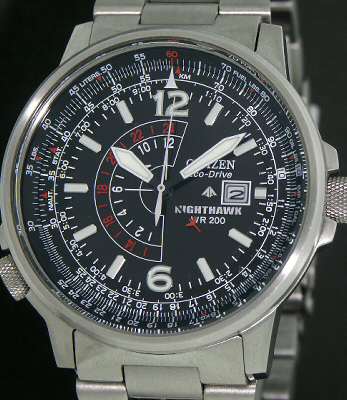 Citizen BJ7000-52E NIGHTHAWK Eco-Drive wrist watch with CITIZEN Rechargeable by light Eco-Drive Quartz movement. Stainless steel case with inner rotating bezel and E6B pilots scale controlled by separate crown, black color dial with date calendar, Second Time zone, stainless steel watch band with tri-fold clasp and spring release, 200m water resistance.
