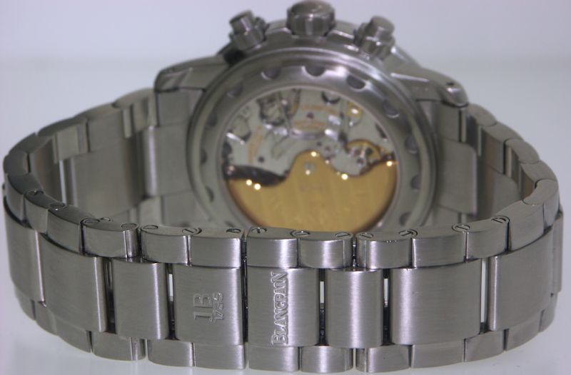 Blancpain "Leman Aqua Lung Flyback" automatic chronograph in all satin stainless steel case, with observation back, and band, black dial. Powered by 37 jewels caliber F185