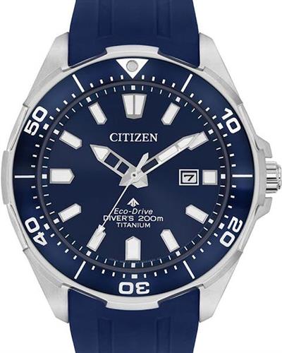 Citizen Promaster Diver BN0201-02M powered by Citizen Eco-drive movement. Titanium case, blue 0-60 bezel, blue dial with date calendar and luminous markers, blue rubber band. Water resistant to 200 meters