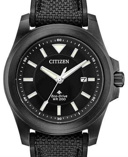 Citizen Promaster Tough BN0217-02E powered by Citizen Eco-drive movement. Super Titanium coating on a stainless steel case, black cordura strap, black dial with date calendar and luminous markers. Water resistant to 200 meters