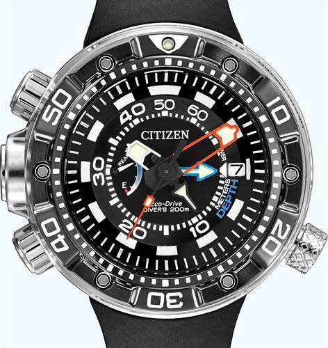 CITIZEN Promaster Aqualand 200 Depth Meter watch model BN2029-01E. Stainless steel case with black polyurethane strap. Black dial. Date calendar. Power reserve indicator. Auto start dive mode. Depth display. ISO compliant. Pusher at 8 o`clock shows maximum depth and pusher at 10 o`clock - reset