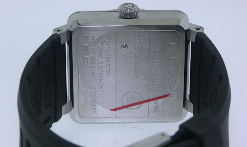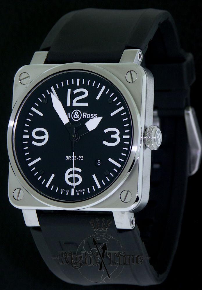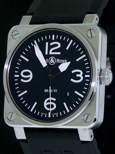 Bell & Ross "Aviation" Date BR03-92-S model. Swiss ETA 2892-2 automatic movement. Stainless steel 42mm case. Black Dial with large Arabic numerals. Black factory rubber band.