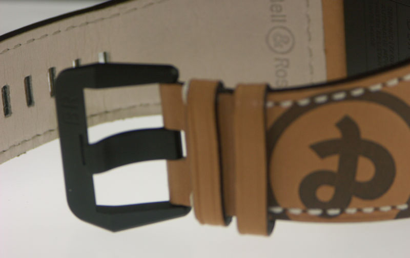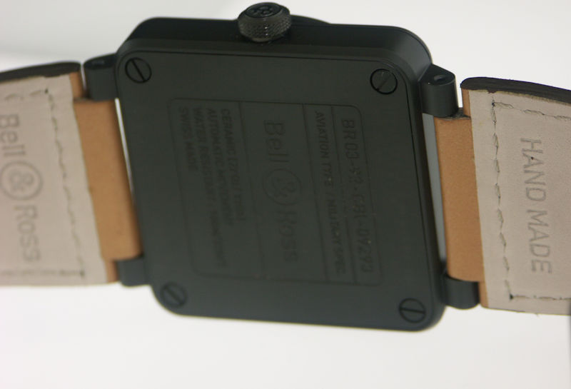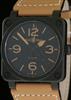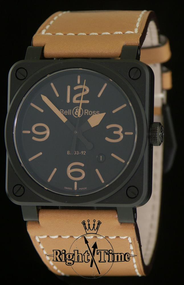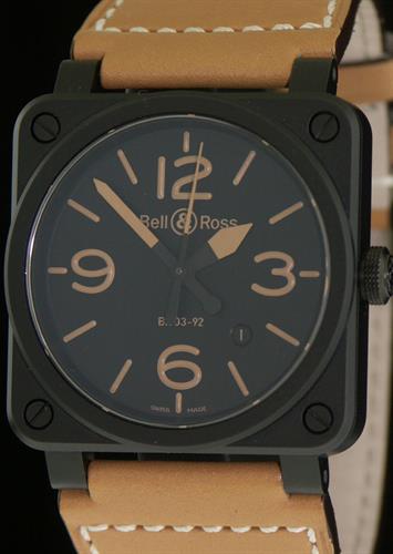 BR03-92 Heritage automatic from Bell & Ross. 42mm black ceramic square case. Automatic ETA2892-2 Swiss automatic movement. Black dial with sand-colored luminous numerals/markers. Tan. hands and markers matching, leather strap with B&R logo imprinted at 12 o`clock.