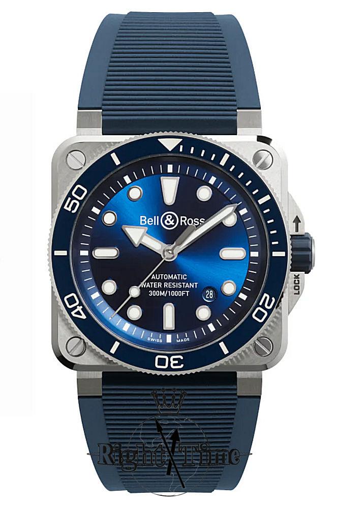 Bell & Ross BR 03 Diver Blue Steel watch model BR03A-D-BLU-ST/SRB powered by Swiss automatic movement. Water resistant to 300 meters. Blue dial with large luminous indexes. Comes in a square stainless steel case on a blue rubber band.