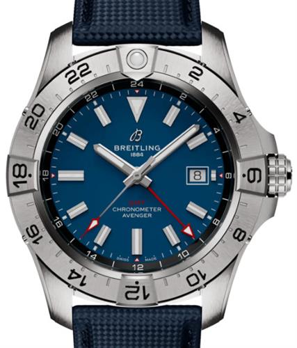 Breitling Avenger GMT model A32320101C1X1. Solid stainless steel case. Blue dial with luminous filled steel hands and markers. Breitling Caliber 32 automatic movement with date and GMT functions. Sapphire crystal glareproofed on both sides. Water resistant to 300 meters. Blue calfskin leather strap with textile coating.