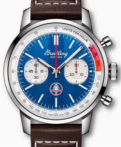 Breitling Top Time B01 Shelby Cobra model AB01763A1C1X1. Swiss made Breitling B01 automatic chronograph movement. Solid stainless steel case. Blue dial with white color sub-dials. Domed sapphire crystal. Brown racing style leather strap.