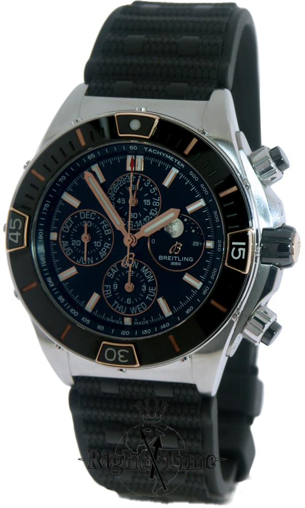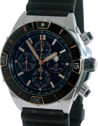 Breitling Super Chronomat model I19320251B1S1. Powered by the Breitling Caliber 19 movement this masterpiece features a triple date, chronograph, moon-phase, and a four year calendar. Solid stainless steel case with an 18kt rose gold and black ceramic bezel. Anti-glare treated sapphire crystal. Black dial with rose tone hands and markers. Black rubber strap with deployment clasp.
