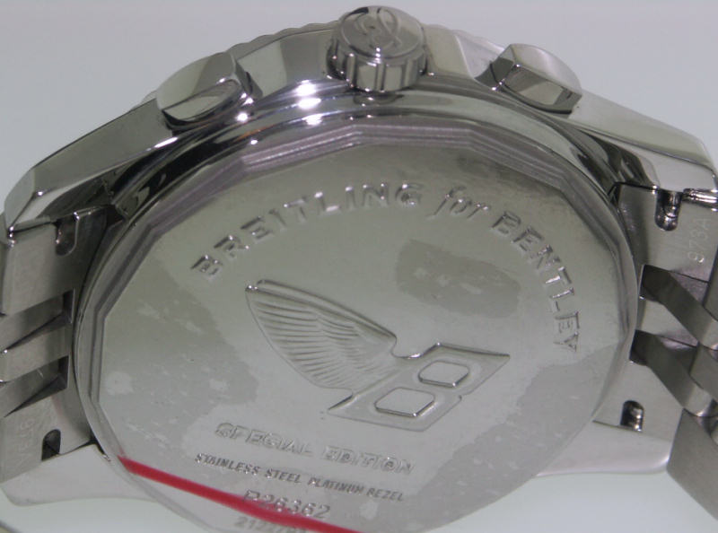 Breitling for BENTLEY Mark VI Special Edition all polished stainless steel automatic chronograph model P26362 with platinum bezel, gorgeous dark chocolate color dial, powered by Breitling modified Cal 26B movement with center 60 minutes and 60 seconds register hands.