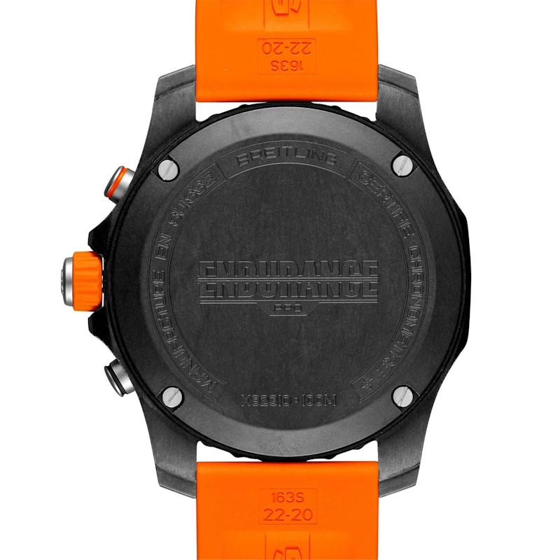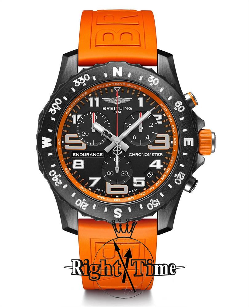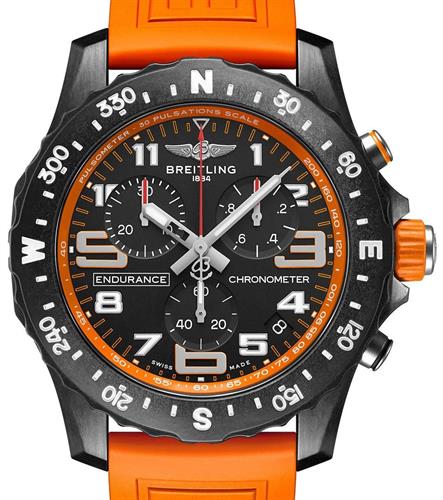 Breitling Endurance Pro model X82310A51B1S1. Swiss made Breitling Caliber 82 thermocompensated superquartz movement. Black color ultra strong and light weight Breitlight case with bi-directional compass bezel. Black dial with orange color accents. Sapphire crystal with anti-glare on both sides. Water resistant to 100meters. Orange rubber strap with Breitlight tang style buckle.