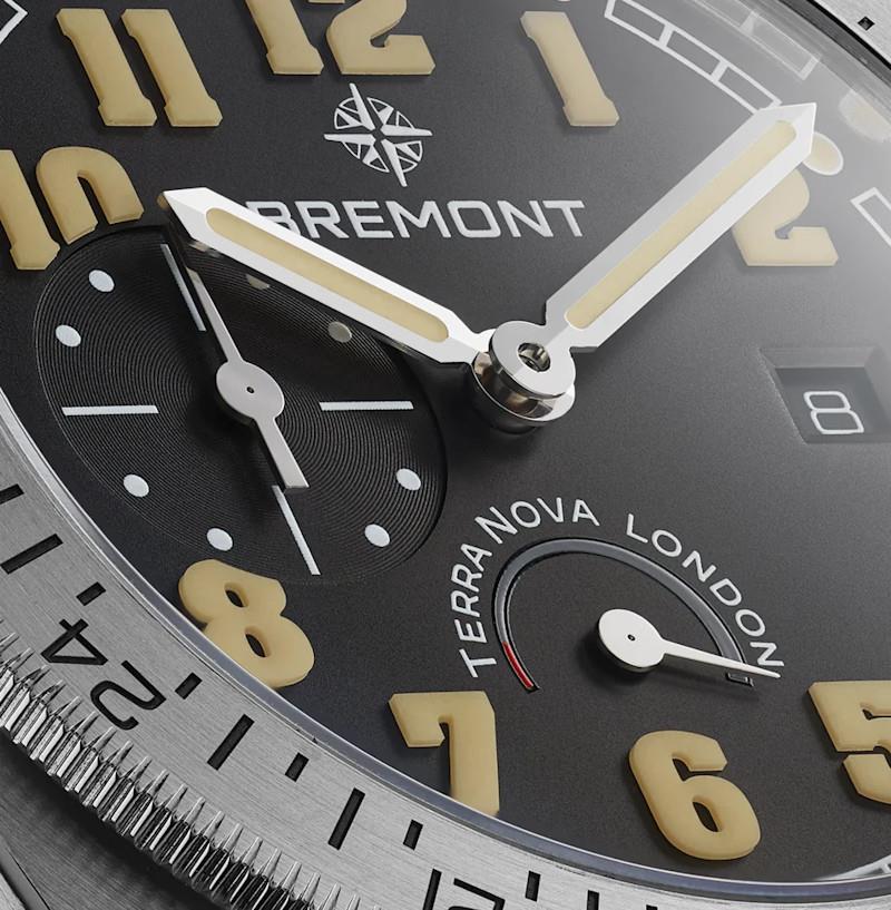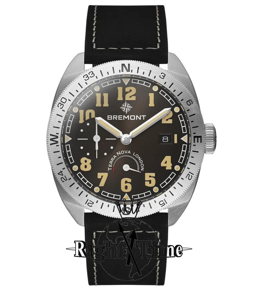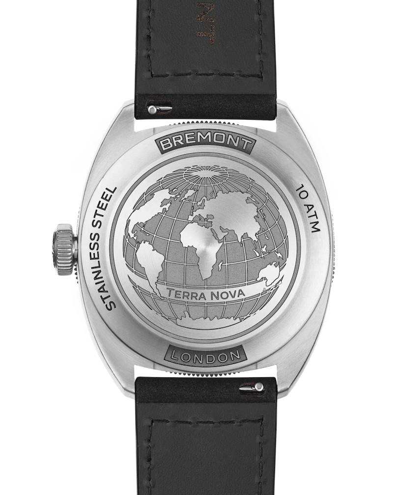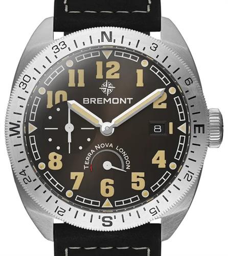 Bremont Terra Nova model TN40-PWR-SS-BK-B. Satin finished stainless steel case. Anthracite/black gradient dial with luminous hands and Arabic numerals. Sapphire crystal. Black nubuck leather strap. Bremont modified Calibre 11 1/2 automatic movement. Water resistant to 100 meters.