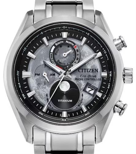 Citizen Lunar dial moon phase model BY1010-57H. Ultra lightweight super titanium case and bracelet are 40% lighter and 5 times stronger than stainless steel. Sapphire scratch resistant crystal. The dial features a grey moon in the center with sub-dials recording day/date, am/pm, and the phase of the moon. Water resistant to 100 meters. Eco-drive solar powered with radio controlled timekeeping.