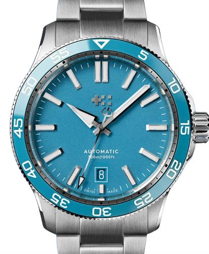 Christopher Ward C60 Trident Pro 300 model C60-40ADA31S0BB2 `Pool Blue`. Swiss made Sellita SW200 automatic movement. Stainless steel case with a Tiffany Blue ceramic uni-directional 60 minute bezel. Blue dial with steel tone luminous filled hands and markers. Sapphire crystal. Stainless steel band with quick-release function. Diver rated to 300 meters water resistant.