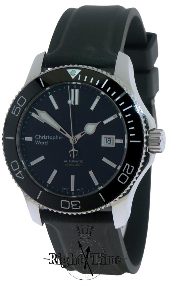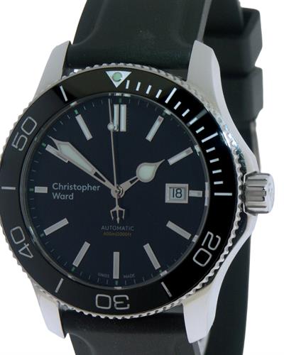 Christopher Ward Trident Pro C60. A British watchmaker watch with Swiss heart. Swiss made Sellita automatic movement. Solid stainless steel. Uni-directional 60 minute bezel with a black ceramic insert. Black dial with steel tone luminous filled hands and markers. Sapphire crystal. Black rubber strap made by Bonetto Cinturini.