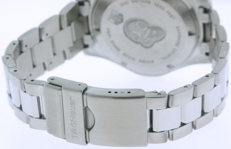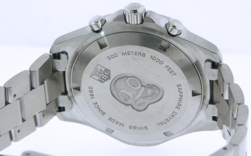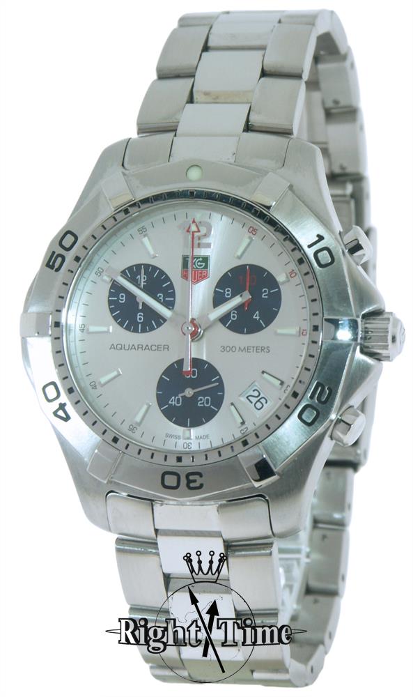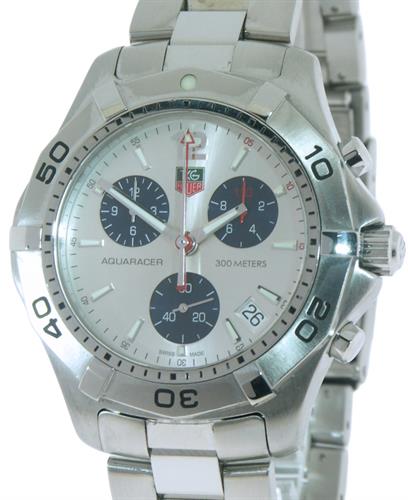 Tag Heuer Aquaracer model CAF1111.BA0803. Swiss made ETA quartz analog chronograph movement. Solid stainless steel case and bracelet. Uni-directional ratcheted bezel with 60 minute scale. Silver dial with blue color sub-dials. Sapphire crystal.