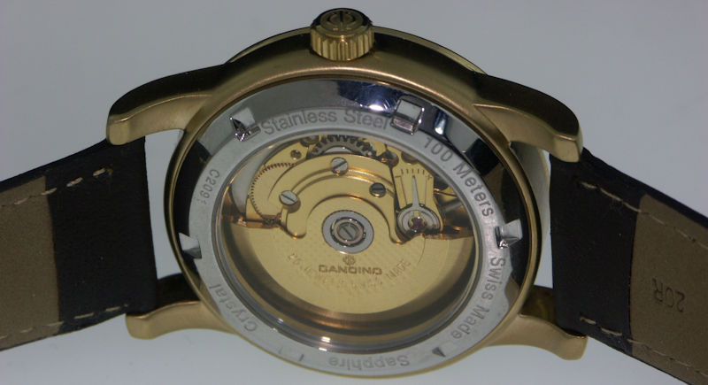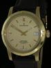 Candino model C2091. Gold plated stainless steel case. Champagne dial with polished gold tone hands and markers. Swiss ETA automatic movement. Sapphire crystal. Leather strap.