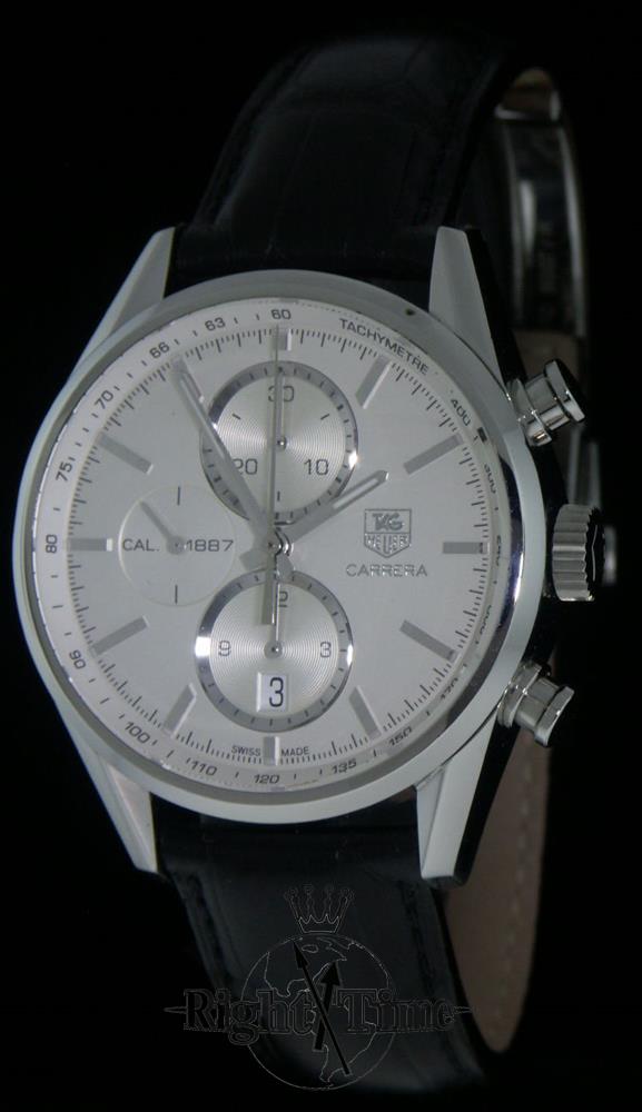 Tag Heuer Carrera CAR2111.FC6266 chronograph model. High polished stainless steel case. Silver dial with steel polished markers and hands. Powered by first manufactured Tag Heuer Calibre 1887 automatic chronograph movement with 39 jewels. Black alligator strap with deployment buckle.