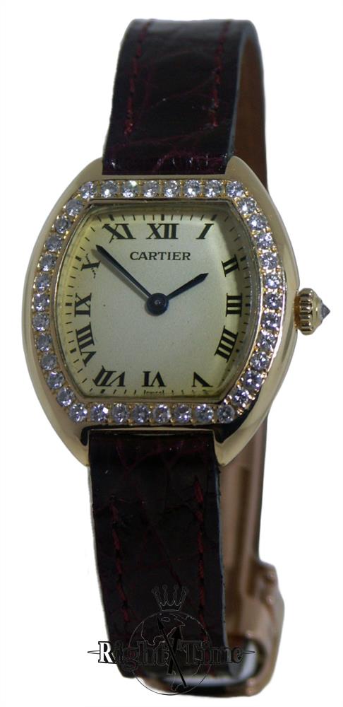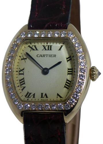 Cartier `Tortue` 18kt solid yellow gold case, factory set diamonds in the bezel and crown, 18kt solid gold deployant factory clasp on burgundy crocodile strap