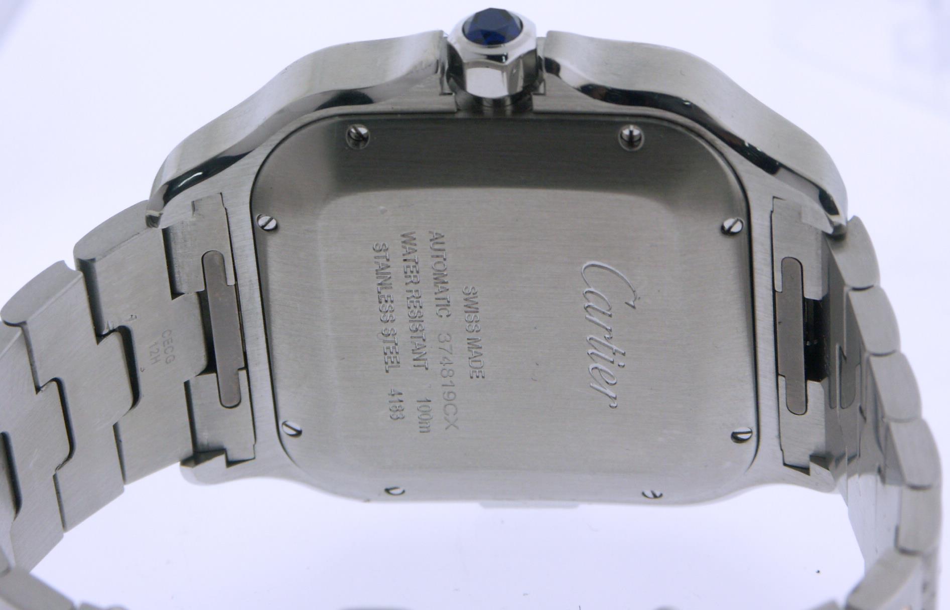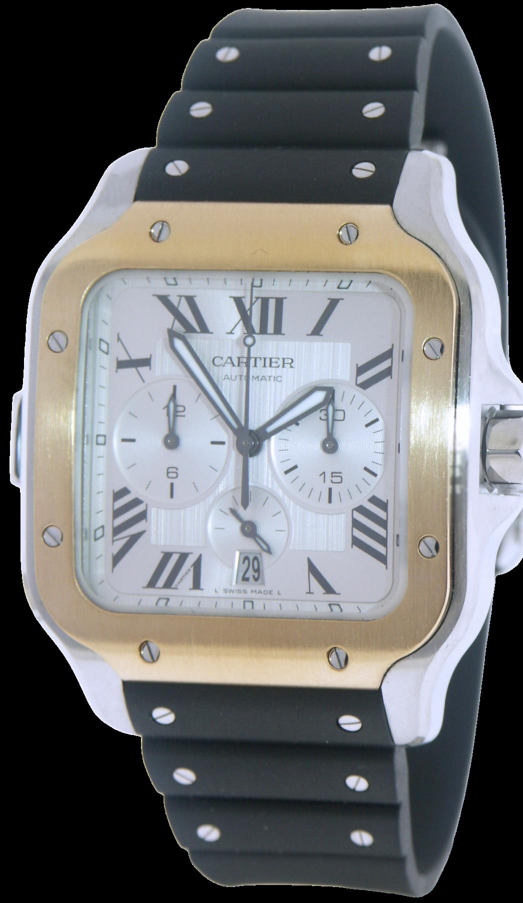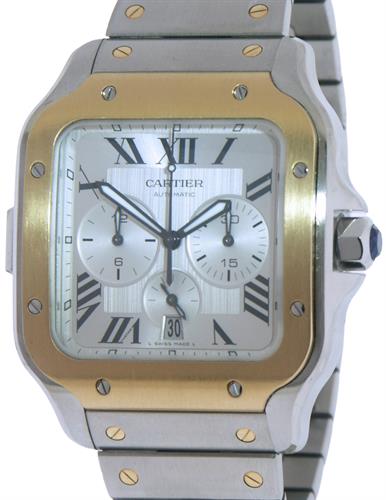 Cartier Santos Extra Large monopusher automatic chronograph, solid stainless steel case and 18kt gold bezel and accents on metal bracelet, comes with extra factory rubber strap on deployant clasp, silver dial with black hands