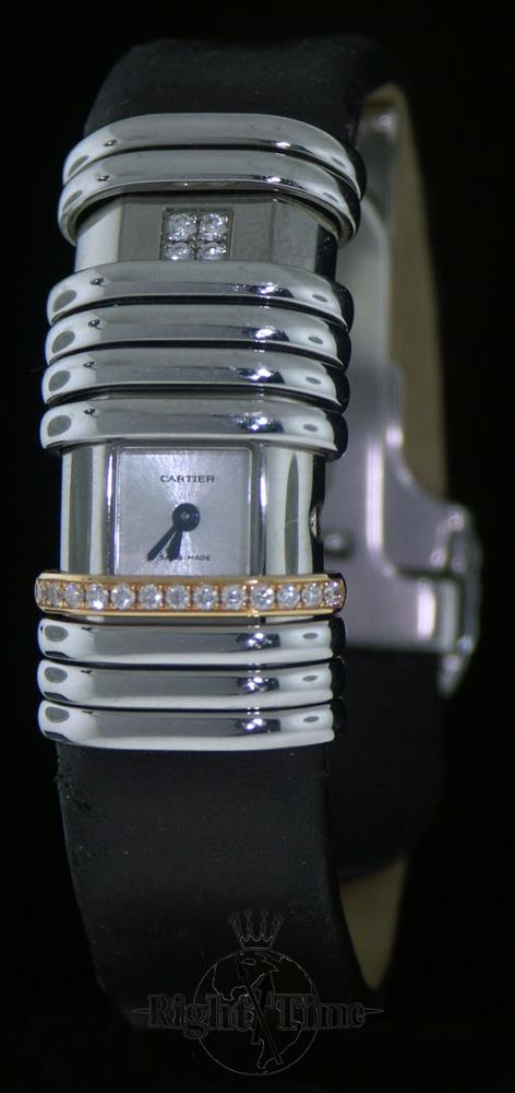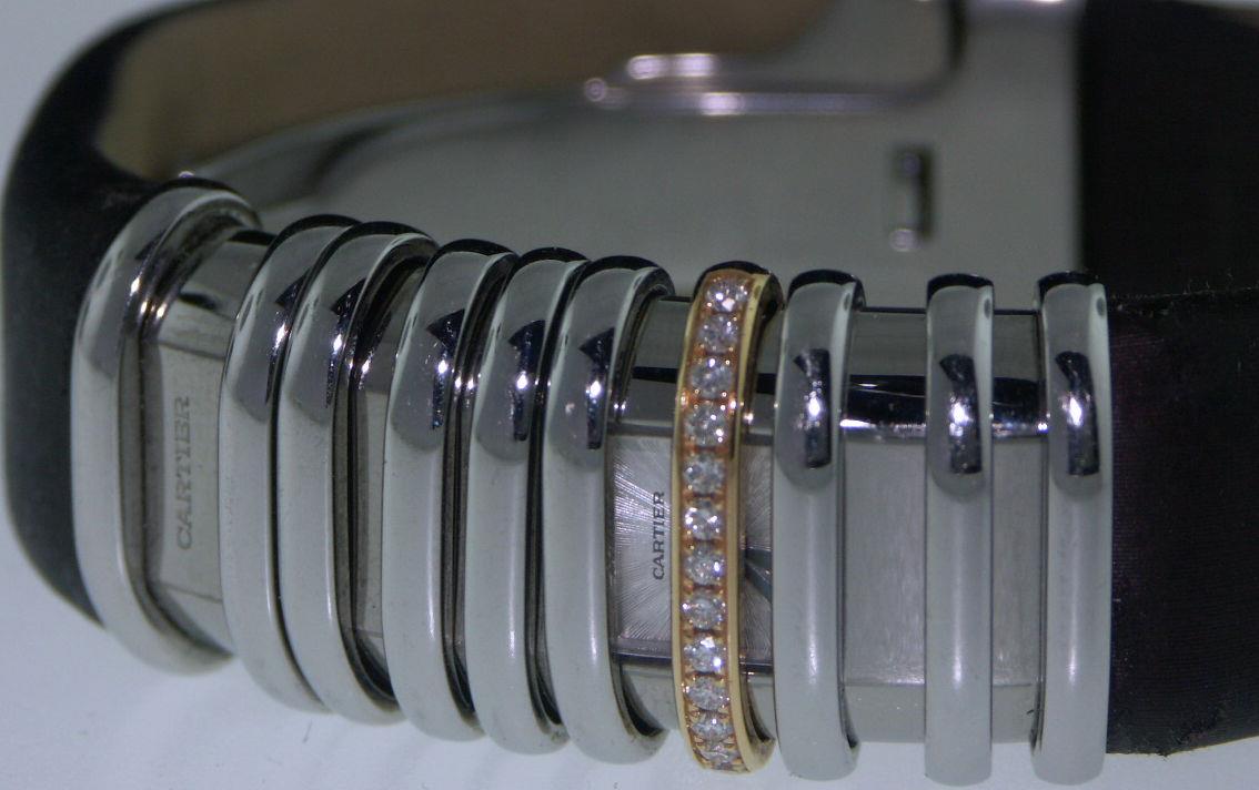 Ladies Cartier Declaration fun model with diamonds and sliding rings, that can be changed, added and modified by the owner at Cartier store. Case is polished titanium, with steel and rose gold diamond sliding rings on brown satin leather strap