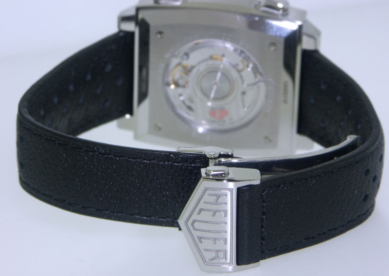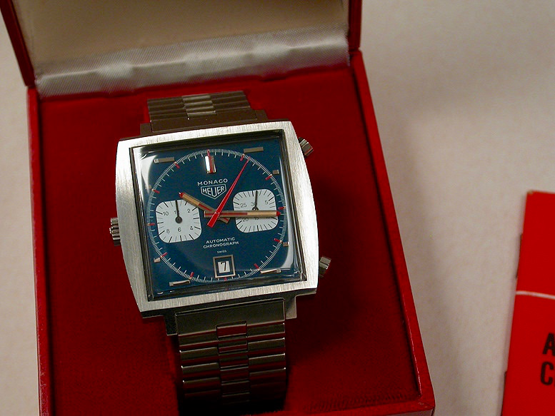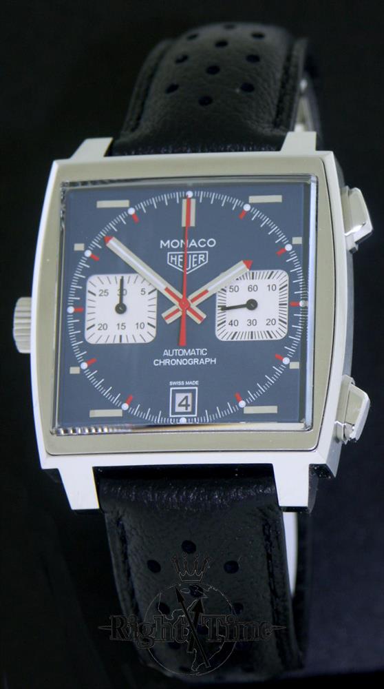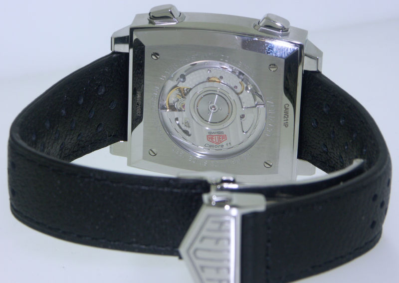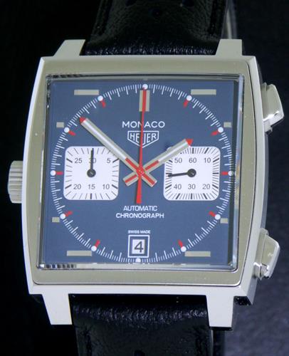 2015 re-edition of Heuer "Monaco", CAW211P.FC6356 model, originally inspired by the Monaco Grand Prix race, and than popularized by Steve McQueen in 1971 movie "LeMans". Stainless steel case with sapphire crystal, powered inside by 59 jewels Heuer Calibre 11 automatic chronograph movement, crown on the left and pushers on right - just like the original 1133 model from the 1969