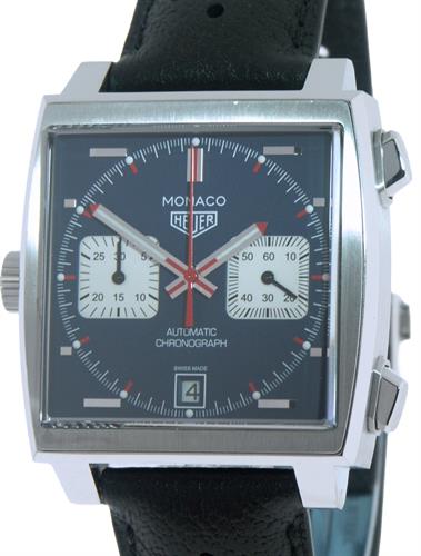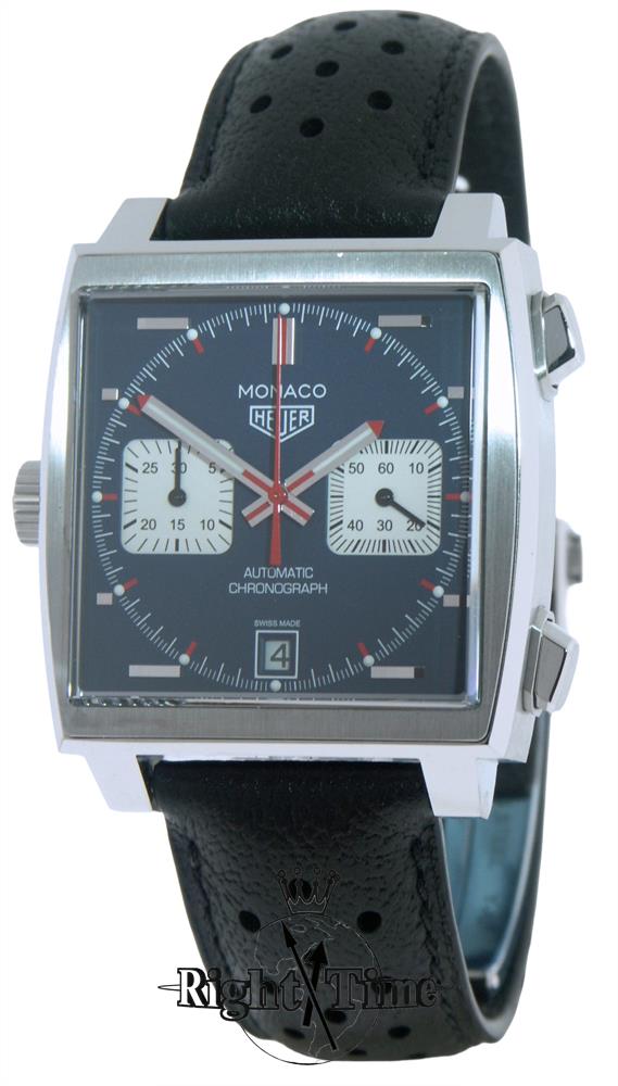 Tag Heuer Monaco factory model CAW211P.FC6356. Inspired by the Monaco Grand Prix race, and than popularized by Steve McQueen in 1971 movie "LeMans". Stainless steel case with domed sapphire crystal. Swiss made Calibre 11 automatic chronograph movement. Blue dial with white/silver color sub dials. Black perforated leather strap with deployment buckle.