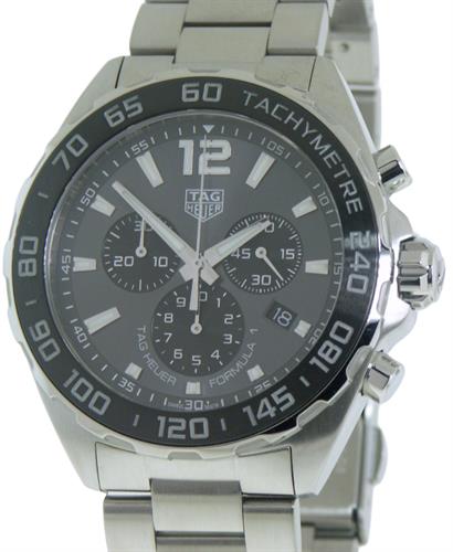Swiss made Tag Heuer divers "Formula 1" quartz chronograph CAZ1011.BA0842 model with gray/black dial, applied steel markers, black ceramic Tachymetre bezel, 200m water resistant, satin finish stainless steel case and band