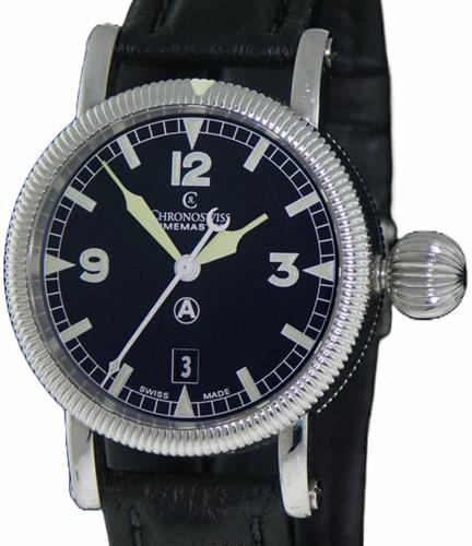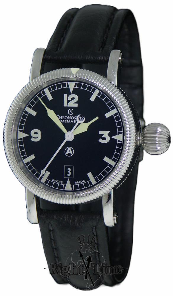 Chronoswiss "TimeMaster" automatic model with black luminous dial and black markers and hands, powered by elabore ETA2892-2 Swiss made movement, housed in a iconic case with upper and lower polished coin edge bezels against vertically satinned case