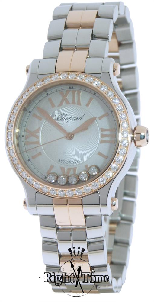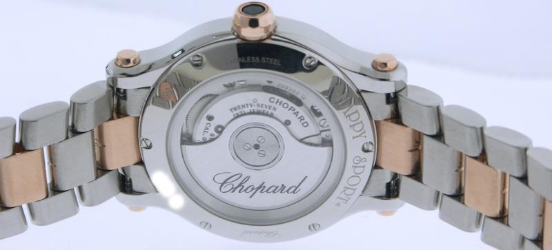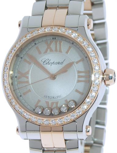 Happy Sport 33mm in-house automatic calibre LUC 09.01-C, ethical rose gold and Lucent Steelâ„¢ case and bracelet, diamond set bezel and floating diamonds between crystals
