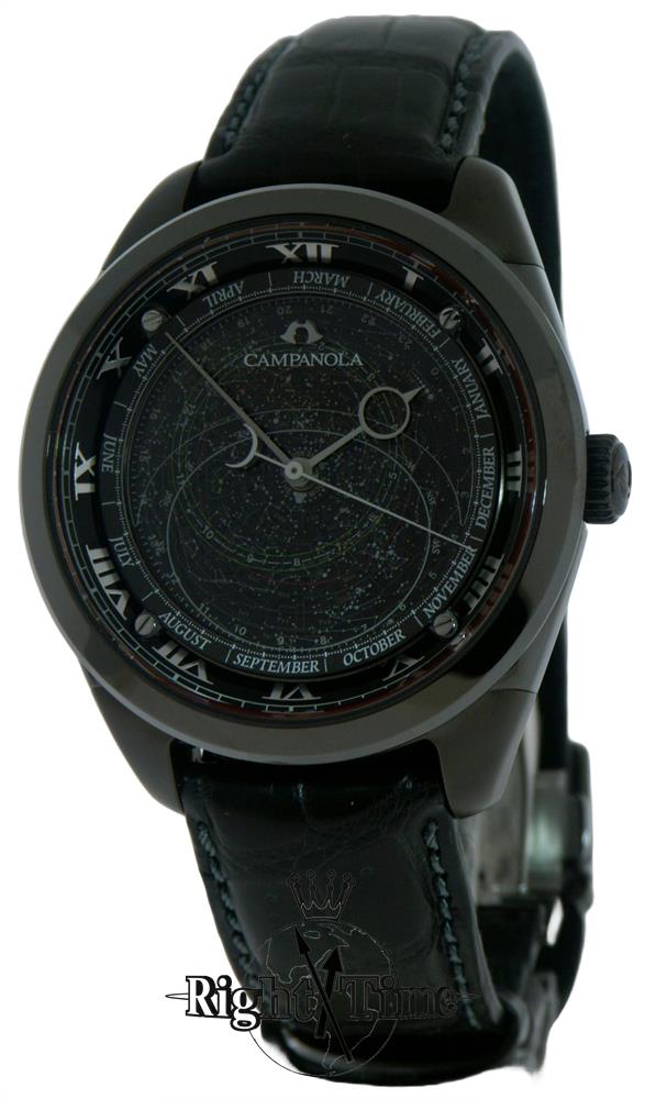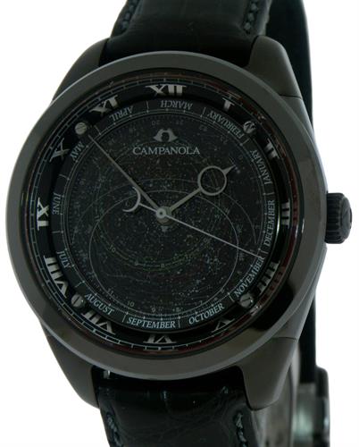Dial is made by a high-precision, 14-plate printing process, the star map shows the night sky as it appears at 35° N latitude. It includes 1,027 stars and planets with a magnitude of 4.8 or brighter, and 166 galaxies and nebulae, including well-known features like the Andromeda galaxy and the Orion nebula. Stars are color-coded according to their temperature, and an ingenious mechanism rotates the map counterclockwise to accurately reflect the retrograde motion of the stars and planets. Viewed through the dome of the sapphire crystal, the star-filled sky is an astronomical wonder.