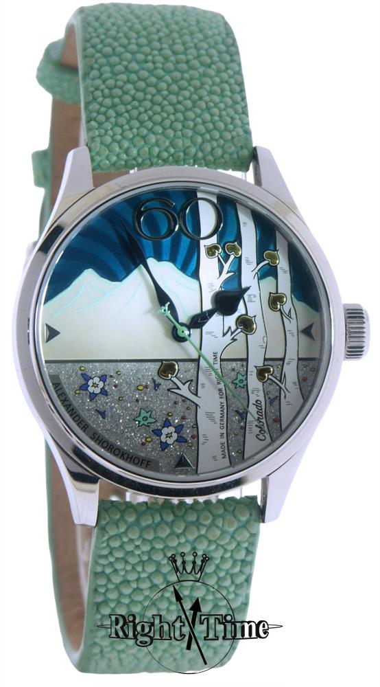Alexander Shorokhoff Avantgarde "Colorado by Right Time" limited edition of 38 pieces, representing the Colorado`s sequential statehood number. Colorado designed custom executed dial, featuring: famous Colorado Rockies snow covered mountain peak made of white mother-of-pearl, hand enameled Columbines flowers peaking through diamond dust "snow" covered ground along the Aspen trees with gold leaves, toped with always clear and turquoise blue skies using a guilloche pattern technique. Stingray strap matching second hand, contrasted by heat blued hour and minute steel hands.