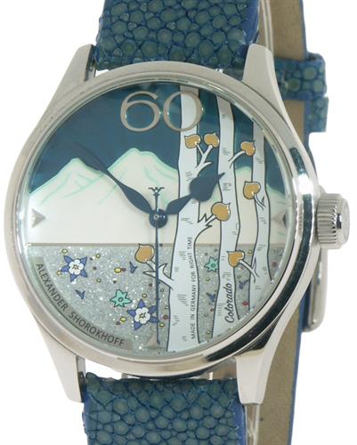 Alexander Shorokhoff Avantgarde "Colorado by Right Time" limited edition of 38 pieces, representing the Colorado`s sequential statehood number. Colorado designed custom executed dial, featuring: famous Colorado Rockies snow covered mountain peak made of white mother-of-pearl, hand enameled Columbines flowers peaking through diamond dust "snow" covered ground along the Aspen trees with gold leaves, toped with always clear and turquoise blue skies using a guilloche pattern technique. Stingray strap matching second hand, contrasted by heat blued hour and minute steel hands.
