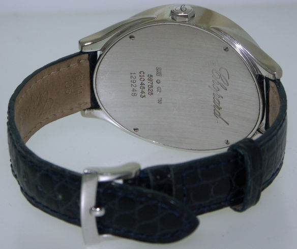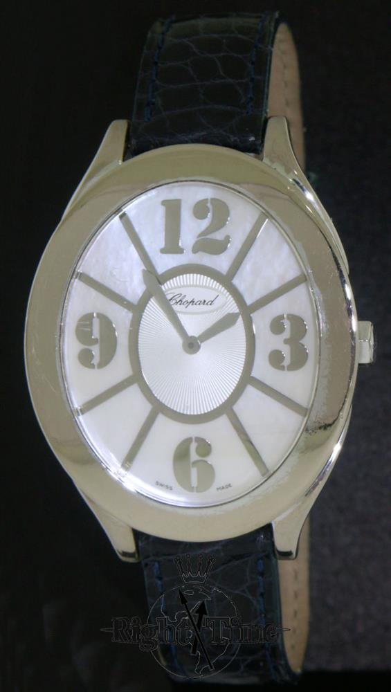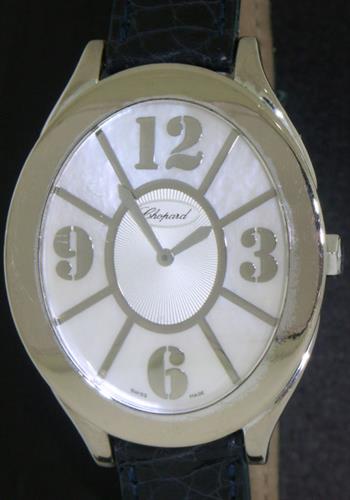 Unisex Chopard "La Strada" heavy (100gr) solid 18kt white gold case and back Swiss made quartz model with mother-of-pearl Arabic dial and 4 different color crocodile straps