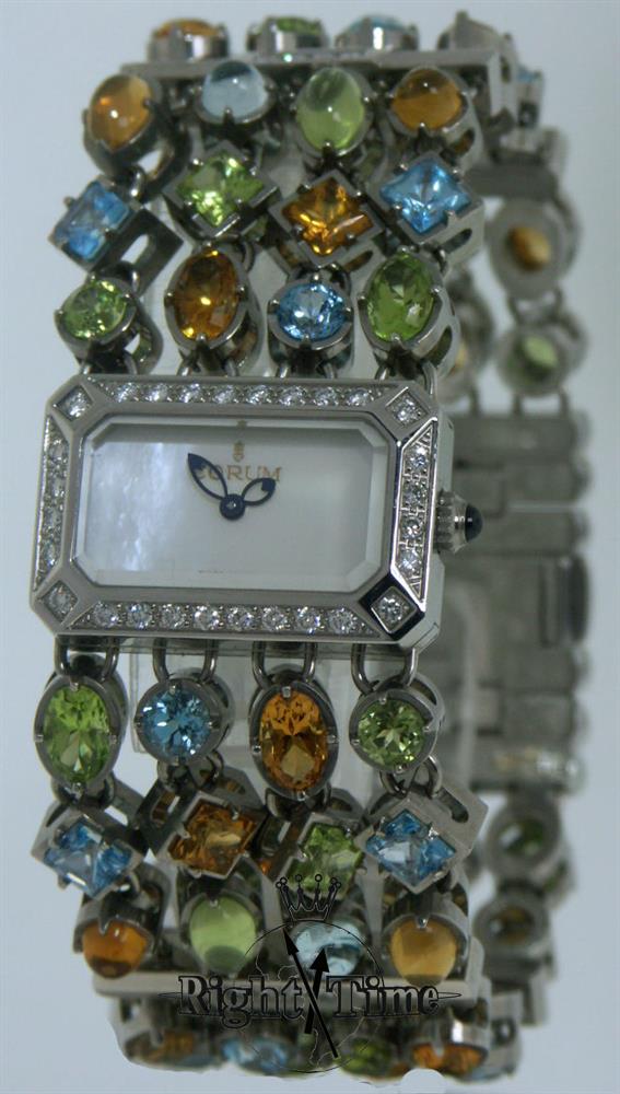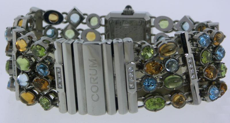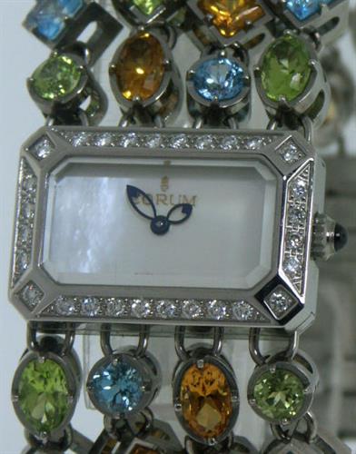 Corum Romantic montres Pot-pourri all stainless steel petit quartz model with diamond bezel, mop dial, band made of many semi-precious stones set in individual bezel settings and loosely connected together in a sea of colorful Citrines, Peridot and Topaz