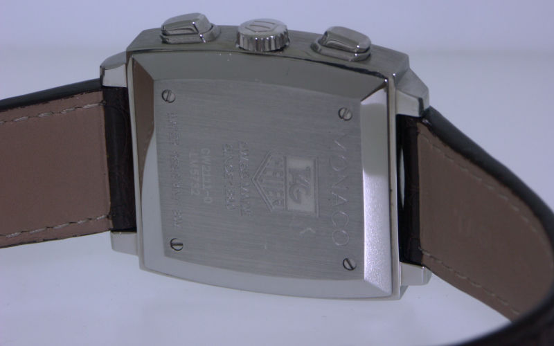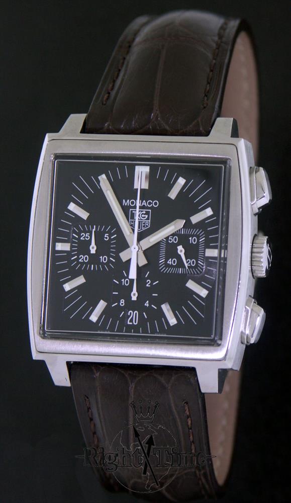 Tag Heuer Monaco, factory number CW2111, inspired by the Monaco Grand Prix race. Similar to the model that was popularized by Steve McQueen in 1969. Powered by a Tag Heuer Calibre 17 automatic chronograph movement. Stainless steel case with acrylic crystal. Brown genuine alligator strap with stainless steel deployment buckle.