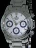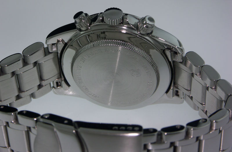 Cyma automatic chronograph "Daytona" look, powered by Valjoux 7750, white enamel dial with blue sub-dial rings, all polished stainless steel case and bracelet