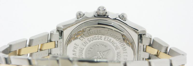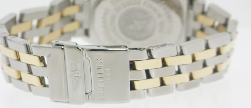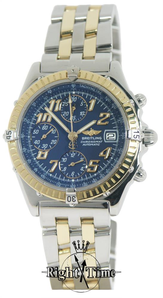 Swiss made Breitling "Chronomat Evolution" model D13350 with automatic chronograph movement housed in polished stainless steel case 18kt yellow gold bezel, steel and 18kt yellow gold "crosswind" style bracelet, blue guilloche dial