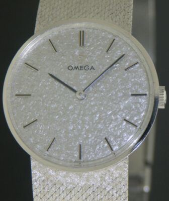 Dress model solid 14KT white gold case and band Omega with 17 jewels manual wind Omega Cal.620 with unusual speckle dial.
