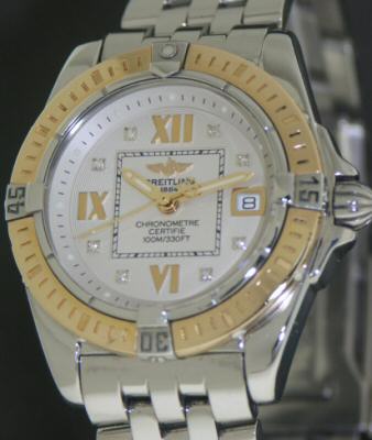 Breitling Lady Windrider cockpit timer Swiss made quartz model, in all polished stainless steel case, 18kt solid yellow gold rotating bezel and diamond studded silver dial.