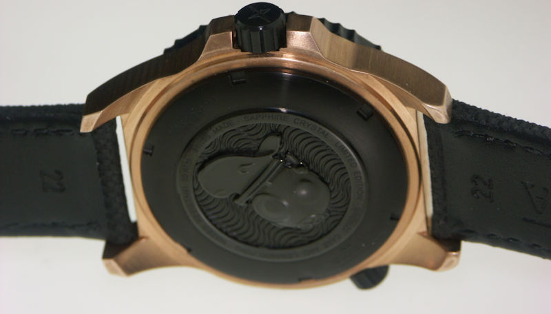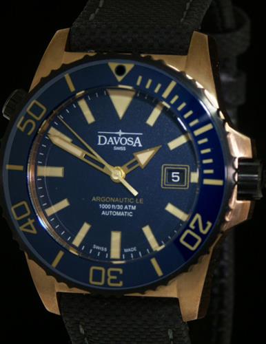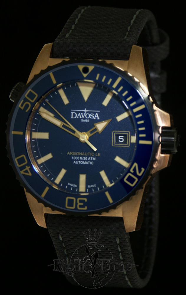 Davosa Argonautic Diver model 161.581.45. Genuine Bronze 42mm case. Uni-directional black PVD bezel with blue 0-60 scale ceramic insert. Black PVD coated screw down crown. Blue dial with luminous markers and hands. Black leather strap with tang style buckle. Sapphire crystal. Diver rated to 300 meters.