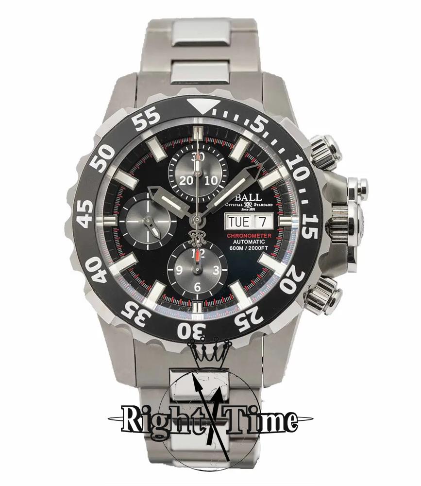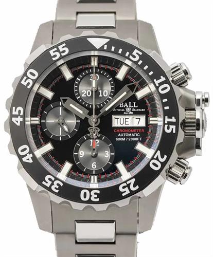 BALL "NEDU" black dial Engineer Hydrocarbon Chronograph watch with automatic ETA7750 COSC certified movement, titanium case with rotating bezel, beveled sapphire crystal, patented crown protection system and helium valve incorporated, and micro gas tubes for night reading capability on dial and in pushers.