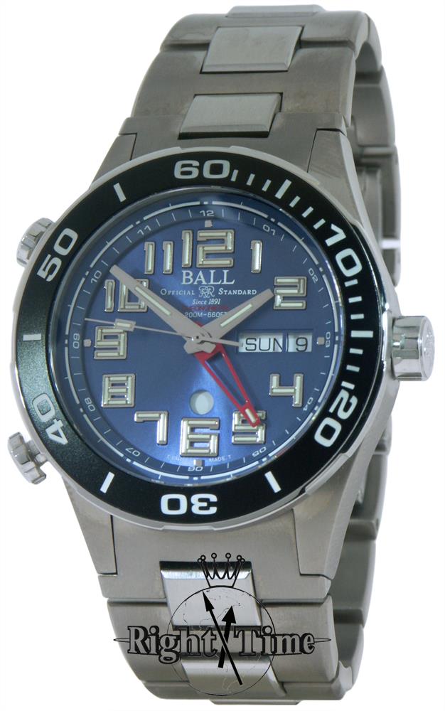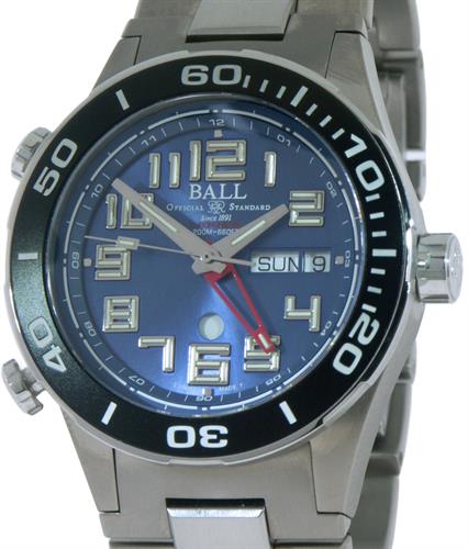 Ball Roadmaster Vanguard model DG3036B-S1C-BE. Limited edition of 1000 pieces Worldwide. Pure titanium case with combination titanium/steel bracelet. Blue dial with tritium Arabic numerals and markers. Uni-directional ratcheted bezel with black 60 minute insert. Steel tone tritium filled hands. Ball automatic caliber BALL RR1303-C movement with day/date and GMT function. Certified COSC Chronometer. Sapphire crystal.