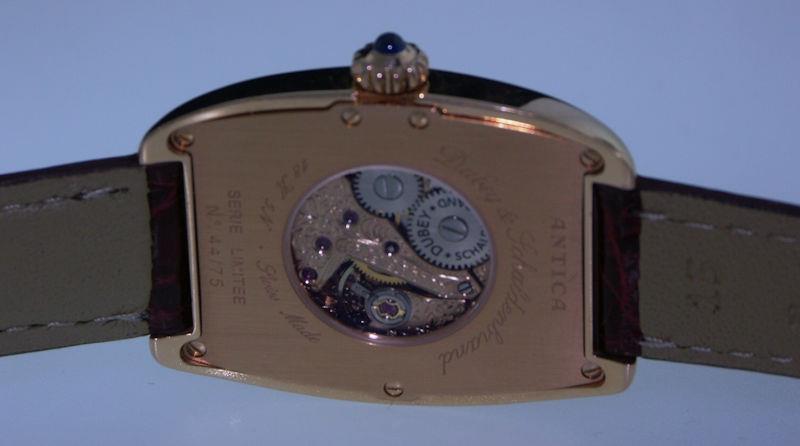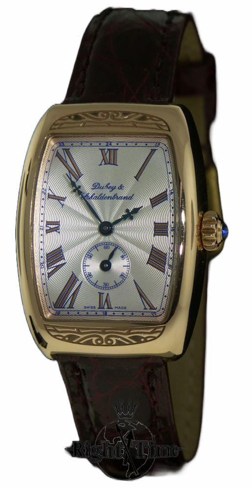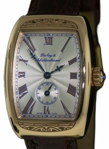 18kt solid rose gold tonneau shaped case "Antica" ladies manual wind model by Swiss watchmaker Dubey and Schaldenbrand. Silver guilloche pattern dial and blued hands