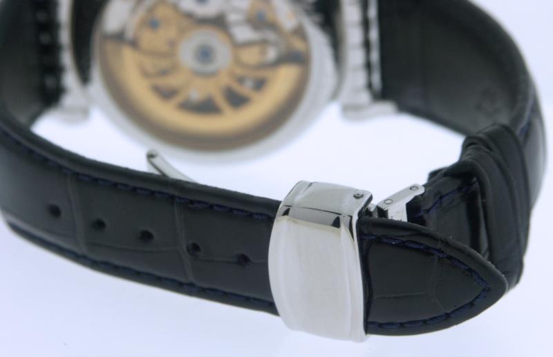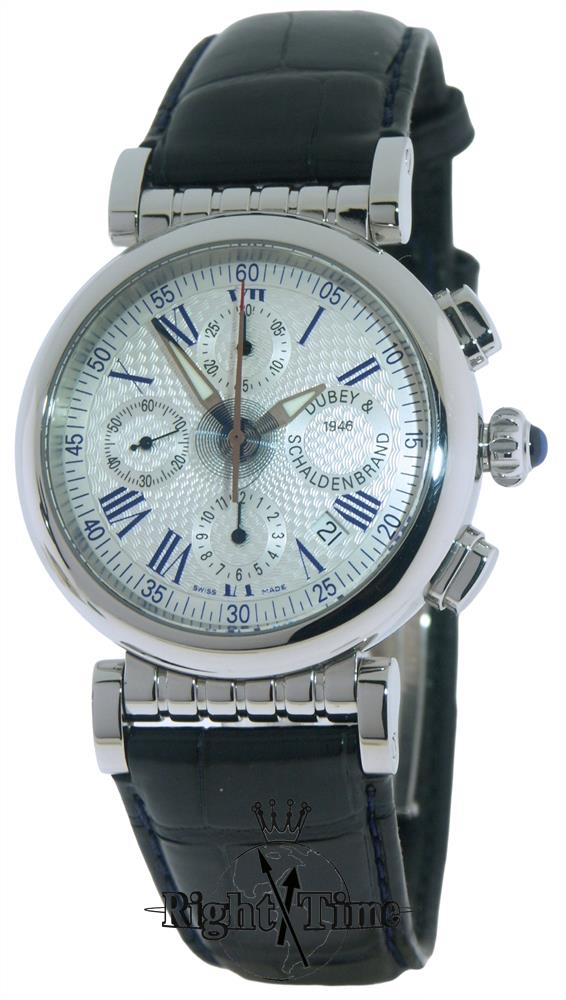 Dubey & Schaldenbrand `Spiral` automatic chronograph model, in highly polished stainless steel case, beautifully guilloched silver dial with blue roman numerals, powered by gilt hand skeletonized and decorated Valjoux 7750 movement on blue leather strap